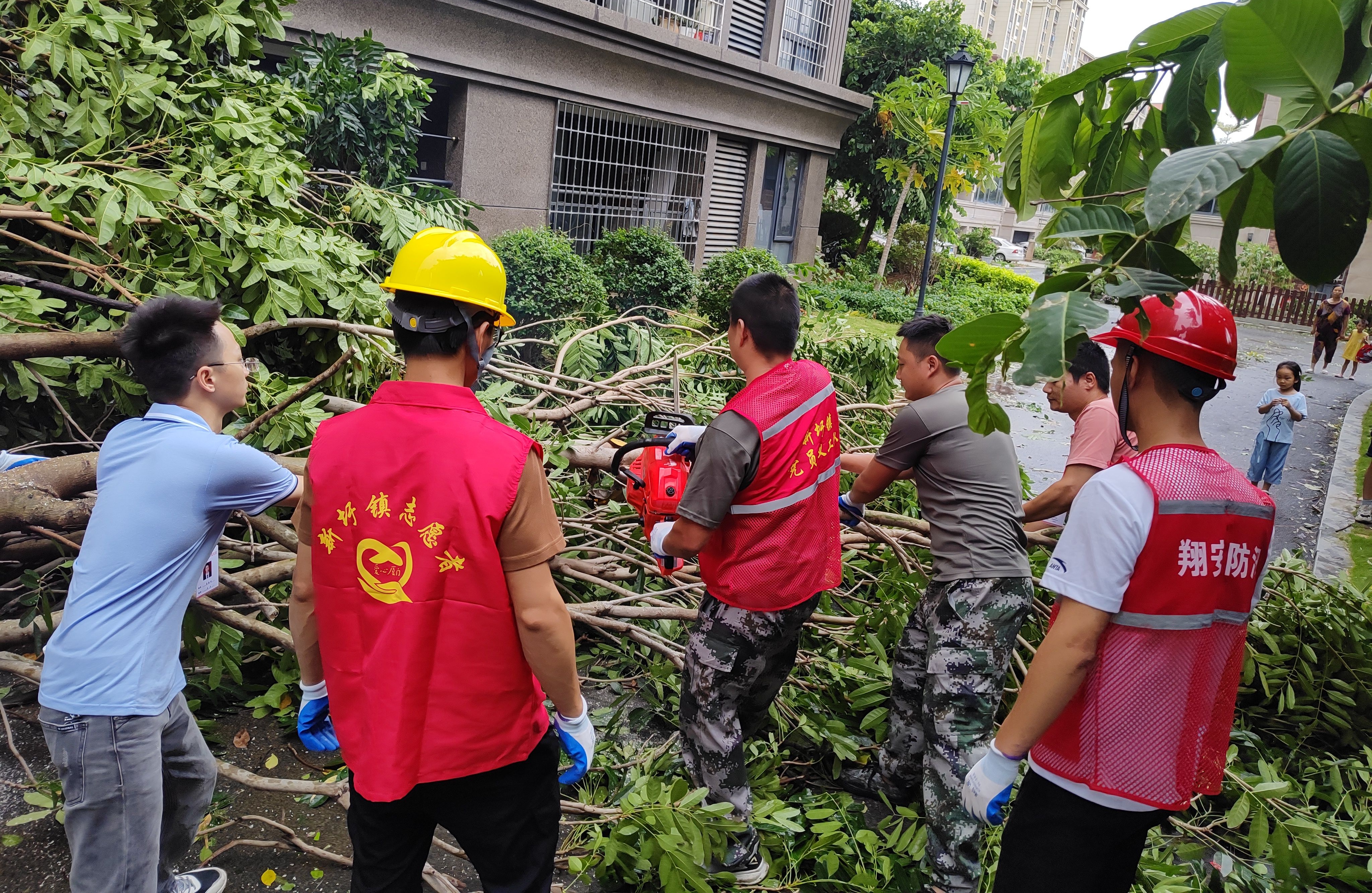 7月28月下午,风雨未停,沙美社区即组织专业力量清除倒伏行道树等障碍物,各网格员开展损失排查统计,同时发动社区居民自发清理房前屋后树枝、垃圾,居民自发参于热情很高。