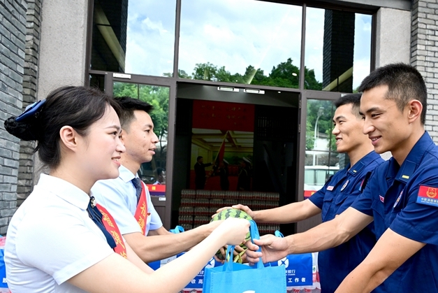 海峡银行工作人员给消防救援人员送上礼包和西瓜。