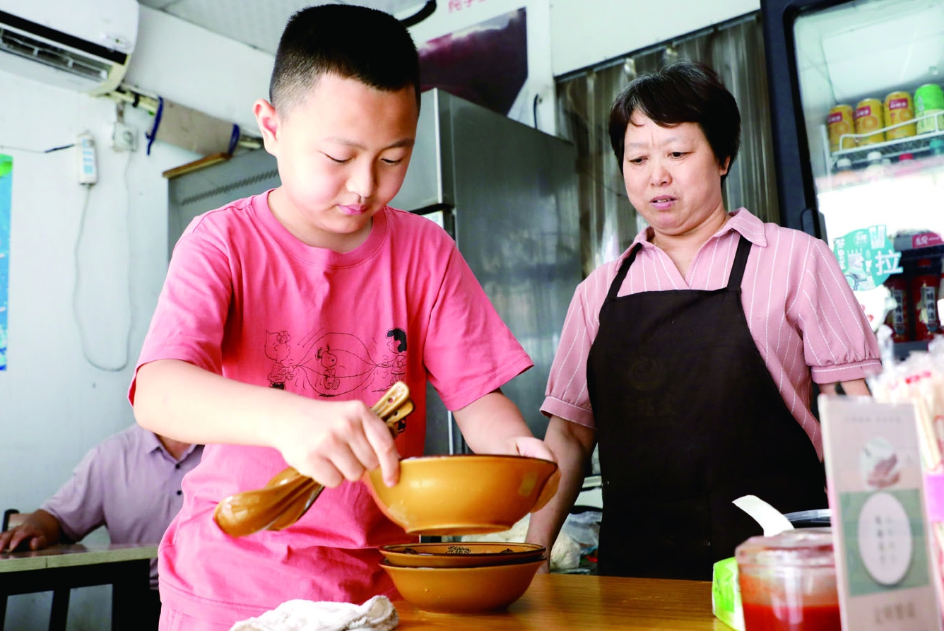 暑期,林渝在店里一边读着课外书,一边帮着爷爷奶奶收拾餐桌上的碗筷。“长大了,我想像关羽一样,武艺高强可以保护家人,忠义傲骨做个有担当的大人。”他说。