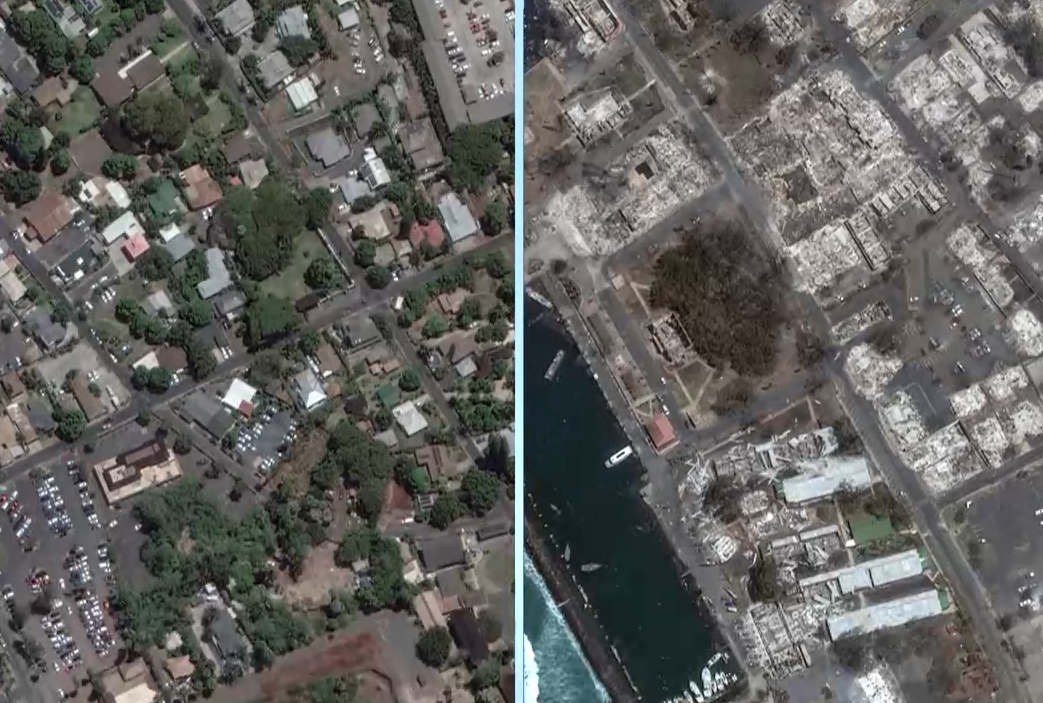 当地时间8日,美国夏威夷州毛伊岛燃起大火,火势凶猛。卫星对比图显示出这场大火给毛伊岛海滨小镇拉海纳带来的严重破坏。