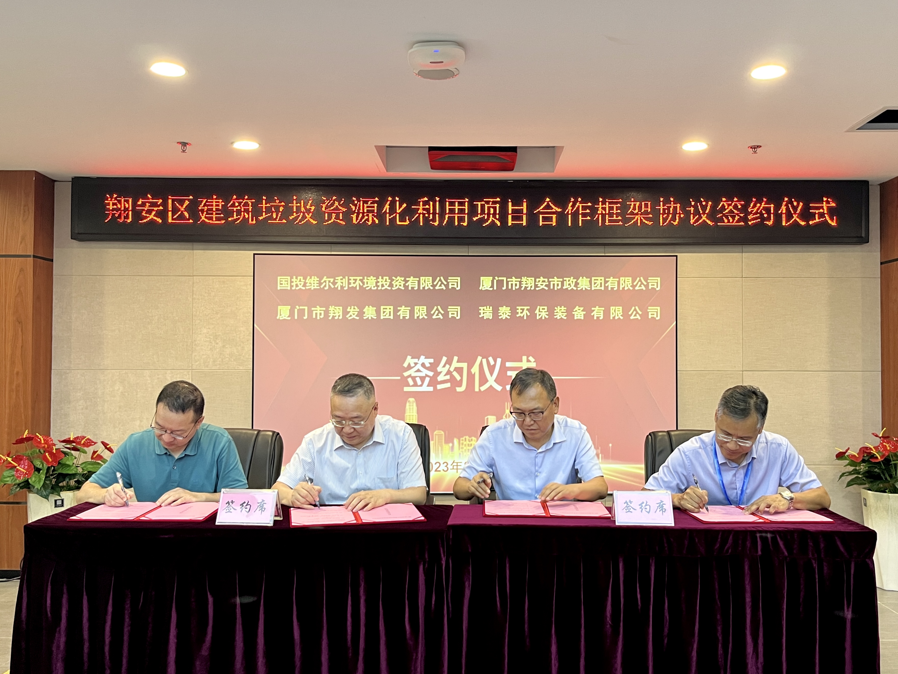 海峡导报·新福建客户端8月17日讯(记者 曾艺轩 通讯员 林洛羽)为全面贯彻党的二十大精神,深入贯彻落实习近平生态文明思想,加快城市建筑垃圾减量化、资源化、无害化,翔安市政集团与国投维尔利环境投资有限公司、翔发集团、瑞泰环保装备有限公司,于翔安市政集团8楼会议室举行建筑垃圾资源化合作框架协议签约仪式。市政集团总经理林灿文,翔发集团总经理徐杰,国投维尔利董事长邱向东,瑞泰环保董事长石志华等领导出席签约仪式。