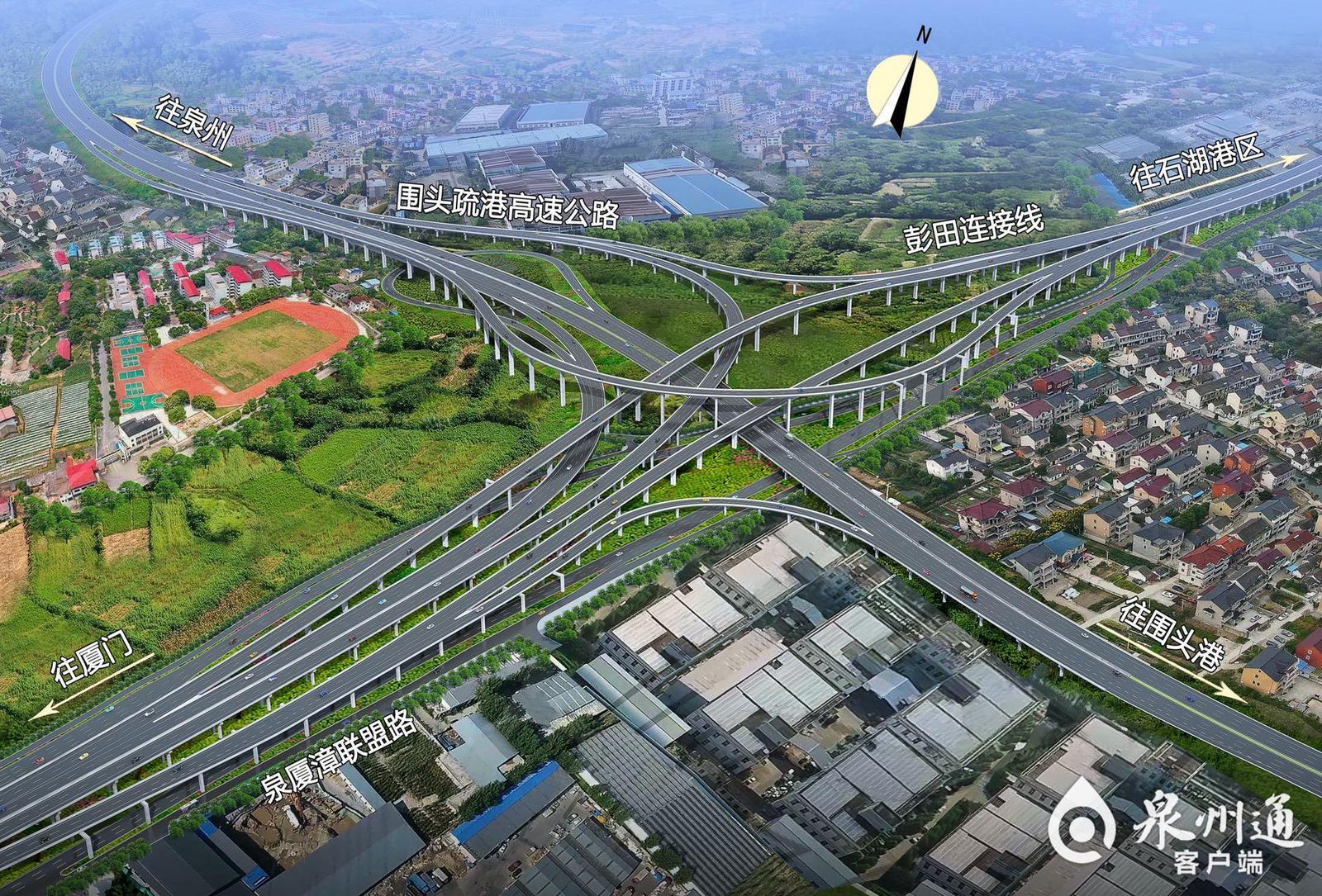 福厦高速公路晋石支线(彭田连接线)西起泉厦漳联盟路与围头疏港高速交叉的福田枢纽,线位向东延伸,经晋江永和、龙湖和石狮灵秀、宝盖、永宁、锦尚两市六镇,终点位于共富路与锦宁路交叉口处。主线全长15.8公里,按高速公路标准,设计时速80—100公里,双向六车道,以高架形式为主。连接线全长1.4公里,采用一级公路标准建设,双向六车道,设计时速60公里。项目全线设福田枢纽、彭田互通两个立交互通,设秀山、后溪两个匝道互通。同时,在石狮灵秀镇彭田村设1个收费站,在塔石设一个出入口。