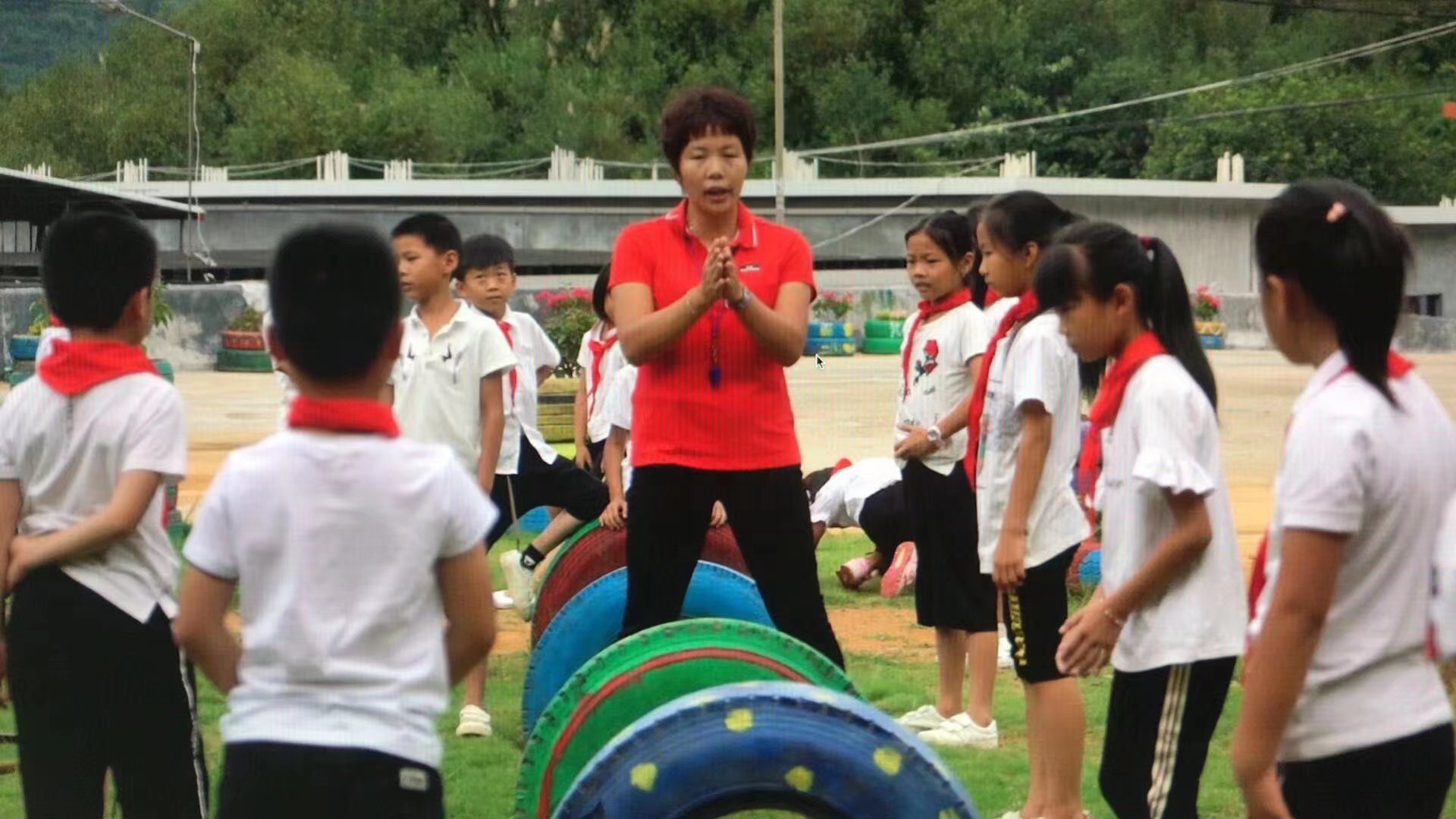 林美珍利用废旧轮胎改造的器材,指导学生跳“土山羊”