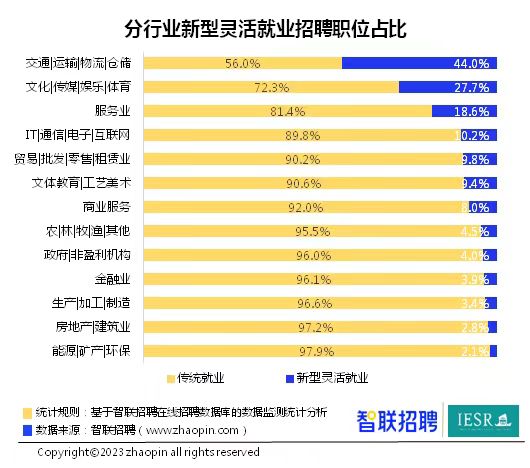 据悉,新型灵活就业职位依托于数字经济发展,在华东地区的增长更快。从招聘端来看,新型灵活就业职位集中于交通/物流/运输/仓储以及文化/传媒/娱乐/体育等行业,与数字经济关联度越高的行业和职业,新型灵活就业职位渗透率越高。