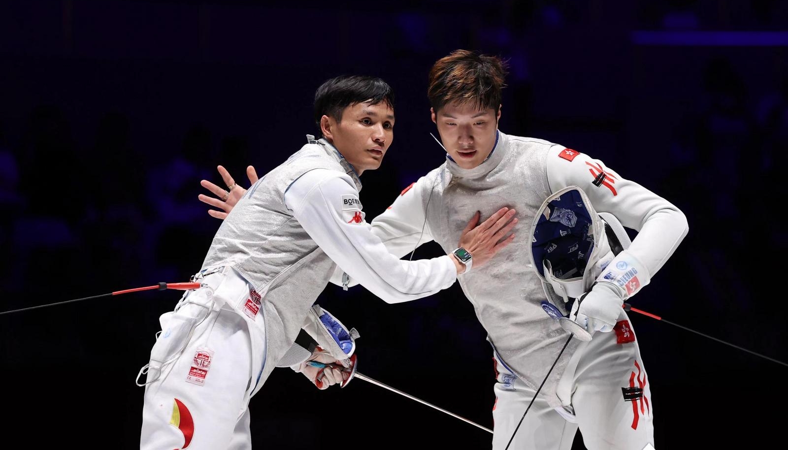 9月27日,在杭州第19届亚运会击剑花剑男子团体比赛中,两名来自福建泉州的运动员陈海威、许杰,与队友吴斌、曾昭然组成的中国队获得银牌。