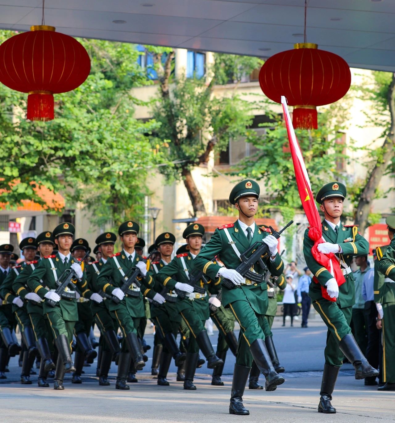 鲜艳的国旗映红脸庞,庄严的国歌催人奋进。上午8时30分,升旗仪式在嘹亮的音乐声中拉开帷幕,护旗队军容严整,精神抖擞,簇拥国旗,迈着铿锵有力、整齐划一的步伐走向国旗台。“敬礼!”,指挥员一声浑厚的口令,升旗手振臂一挥,鲜艳的五星红旗在空中划出一道美丽的弧线,在全场观众的注目下,伴随着雄壮的《中华人民共和国国歌》冉冉升起,高高飘扬在广场上空。国旗下,官兵们军容严整、精神振作,向五星红旗致以最崇高的敬意。