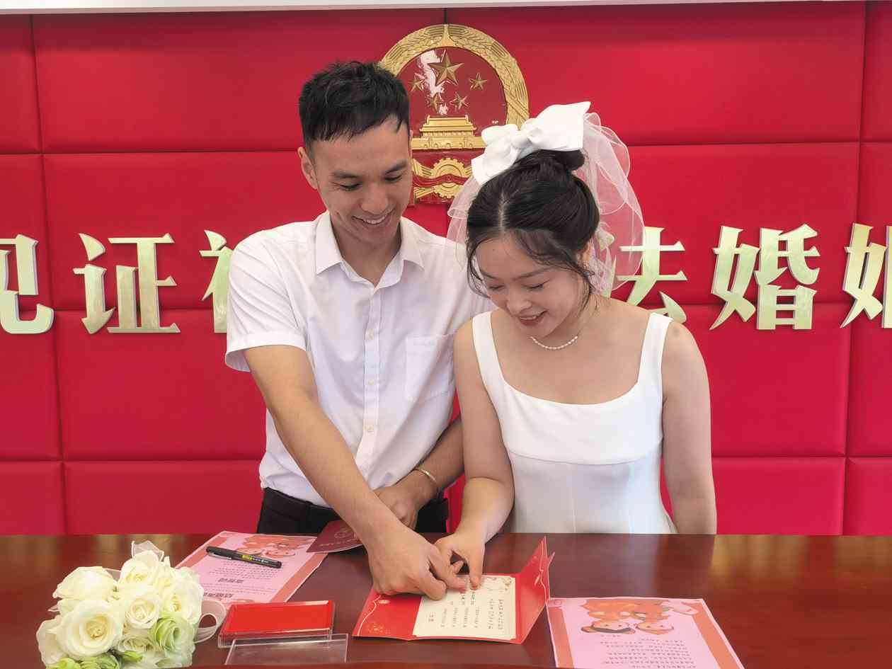 在湖里区婚姻登记处,海峡导报记者看到,民政部门早早做好了准备,为前来领证的新人送上最贴心的服务和最真挚的祝福。小礼堂内,一沓厚厚的婚书摞在宣誓台上,来自培善社会服务中心的社工和志愿者们为新人证婚、颁证,并为他们留下最美好的影像记录。