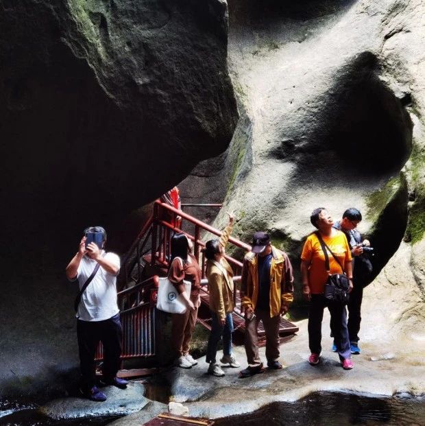 庄顺福一行先到九龙洞景区实地考察,在讲解员的带领下,沿路游览了“葫芦潭”、“金蟾戏水”和“飞天井”等景观,切身体验白云山风景区的优质资源和自然风光。庄顺福一行对白云山的壶穴奇观大为赞赏,感叹大自然的鬼斧神工,并就景区在地质遗迹保护、基础设施建设和地学科普宣传等方面展开了探讨交流。随后,庄顺福一行参观宁德世界地质公园博物馆,观看宁德世界地质公园宣传片,听取讲解员依次对十个展厅的介绍,在边看边走中领略宁德世界地质公园多彩的地质文化。
