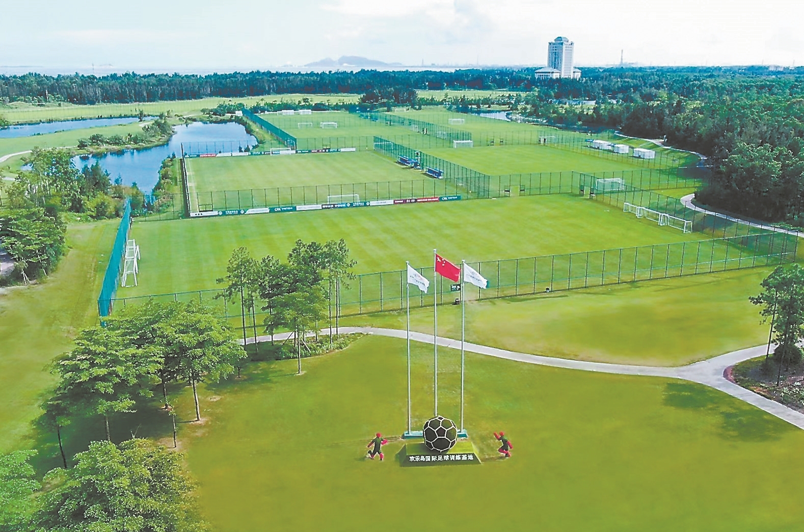 “这里温度适宜,夏无酷暑,冬无严寒,适合足球比赛和训练。”欢乐岛执行总监江涛介绍,基地坐拥湾、林、湖、海四大稀缺自然景观资源,环绕7000亩原生态松林,开展足球运动得天独厚。