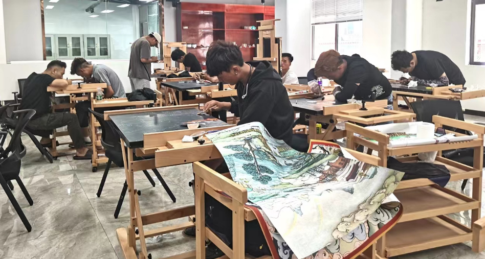 学员们从绘制草图到画板描摹,从贴蛋壳到颜料上色,从烘干到水洗打磨……普普通通的蛋壳、神奇的漆画颜料和唐卡矿物颜料,在厚厚的漆画画板上发生着奇妙的化学反应,让一幅幅线条勾勒的草图慢慢变得立体、生动、富有感染力。在这里,藏族唐卡内容、西藏风景名胜、汉地人文风情、民族团结等题材艺术地呈现在了唐卡漆画画板上,默默诉说着文艺创新的精彩、文化互鉴的魅力和民族的交往交流交融。