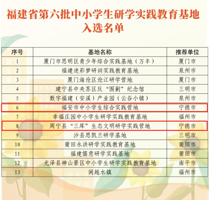 近日,省教育厅印发《关于公布第六批中小学生研学实践教育基地和第四批中小学生劳动教育实践基地名单的通知》,确定13个申报单位入选我省第六批中小学生研学实践教育基地,其中宁德2个;8个申报单位入选我省第四批中小学劳动教育实践基地,其中宁德1个。具体名单如下: