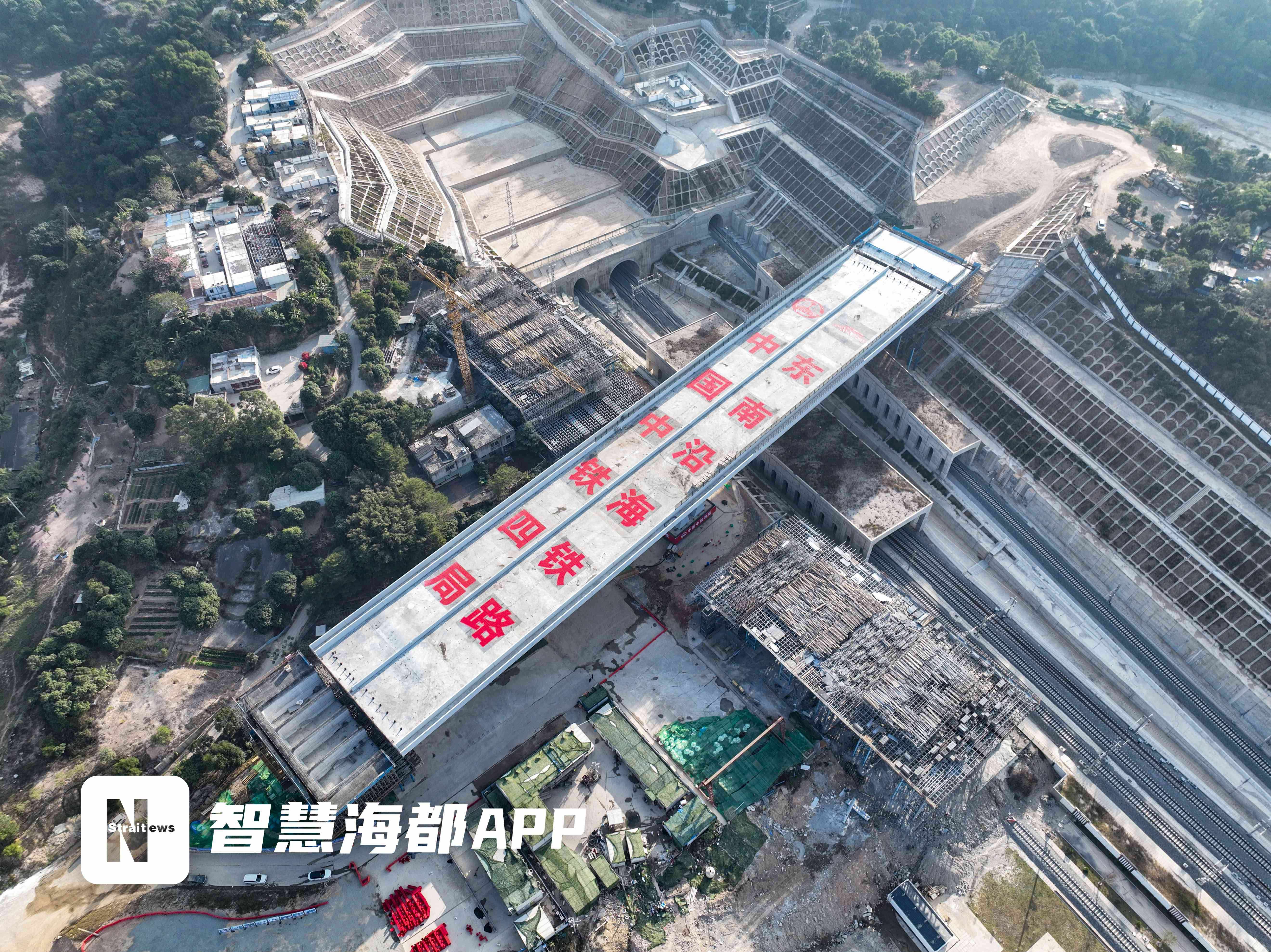 上跨福厦高铁公路桥转体梁转体成功 ,转体梁合龙段,不再位于铁路上方(转体后)