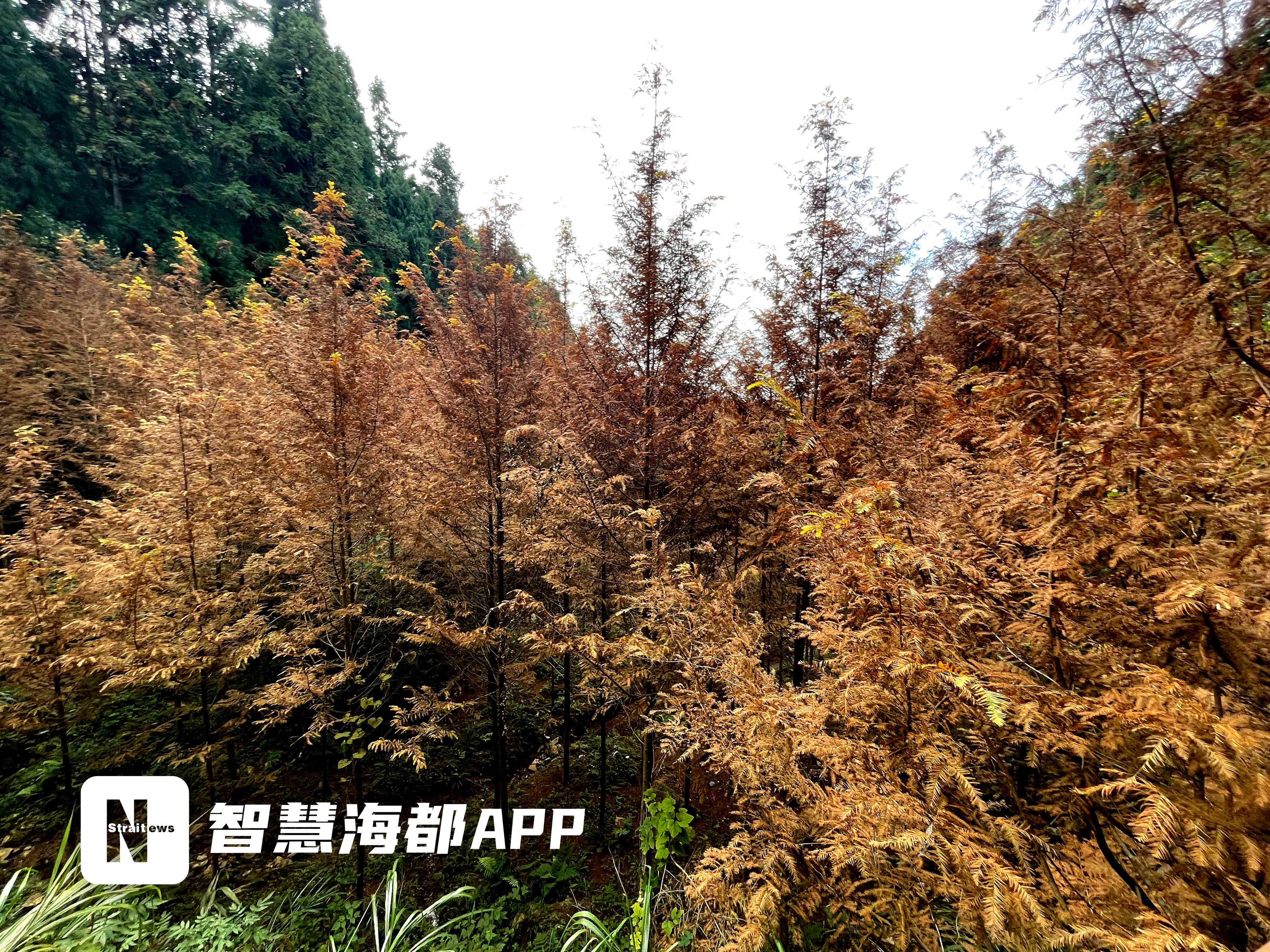 这个季节,鼓岭教堂附近的水杉林叶片由柳绿到樱草黄、杏黄、橙红,渐次呈现不同的色彩,更有鼓岭柳杉常绿树的相衬,别有一番风情,展示出更加迷人的风姿。若你游走在水杉林间,幸运的话,或许能偶遇在水杉林里跳来跳去啃食杉果的小松鼠。