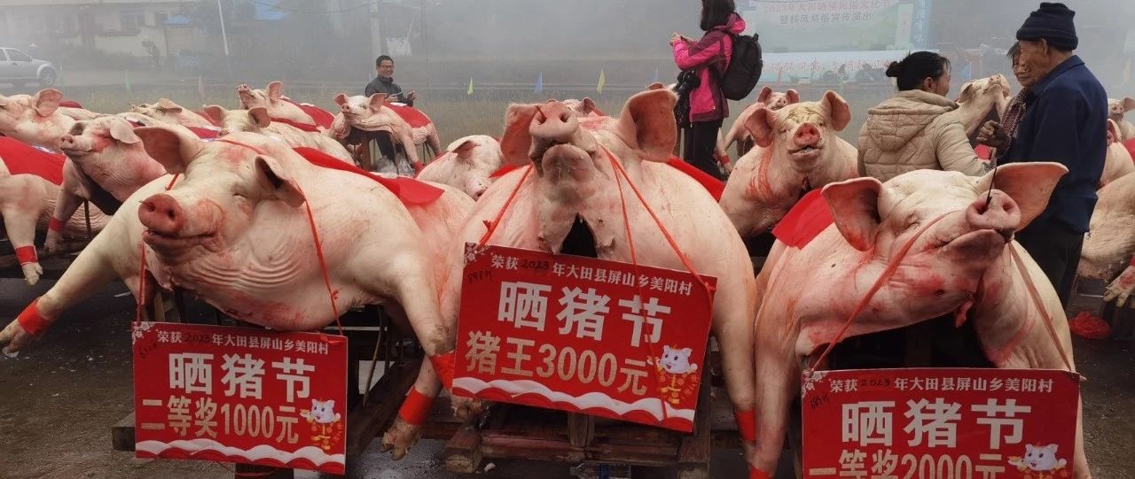 12月5日(农历十月廿三),大田县屏山乡美阳村举办一年一度的传统庙会,村里养猪能手把精心饲养的大猪宰杀后集中亮相,以“晒猪”的形式庆祝丰收,吸引了众多游客前来感受热闹气氛。今年,美阳村村民郭文信家饲养的大肥猪以净重898斤的重量夺得“猪王”称号!