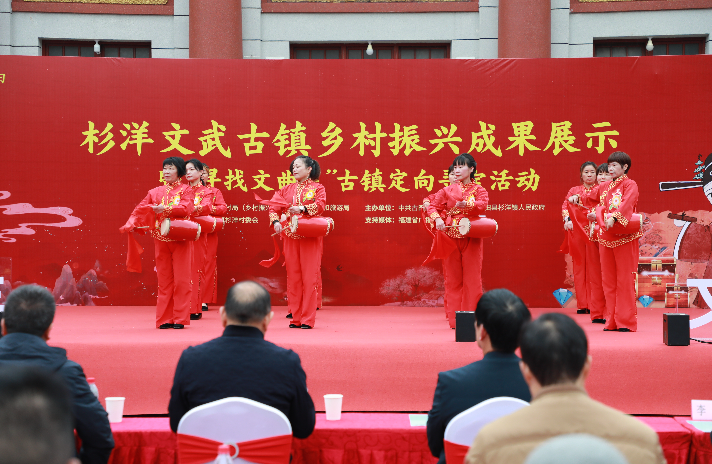 “咚咚锵,咚咚锵……”伴随着阵阵的鼓声,启动仪式在独具杉洋古镇特色的暖场节目中拉开帷幕。暖场节目表演中,上演了杉洋镇龙桩拳等非遗项目表演。