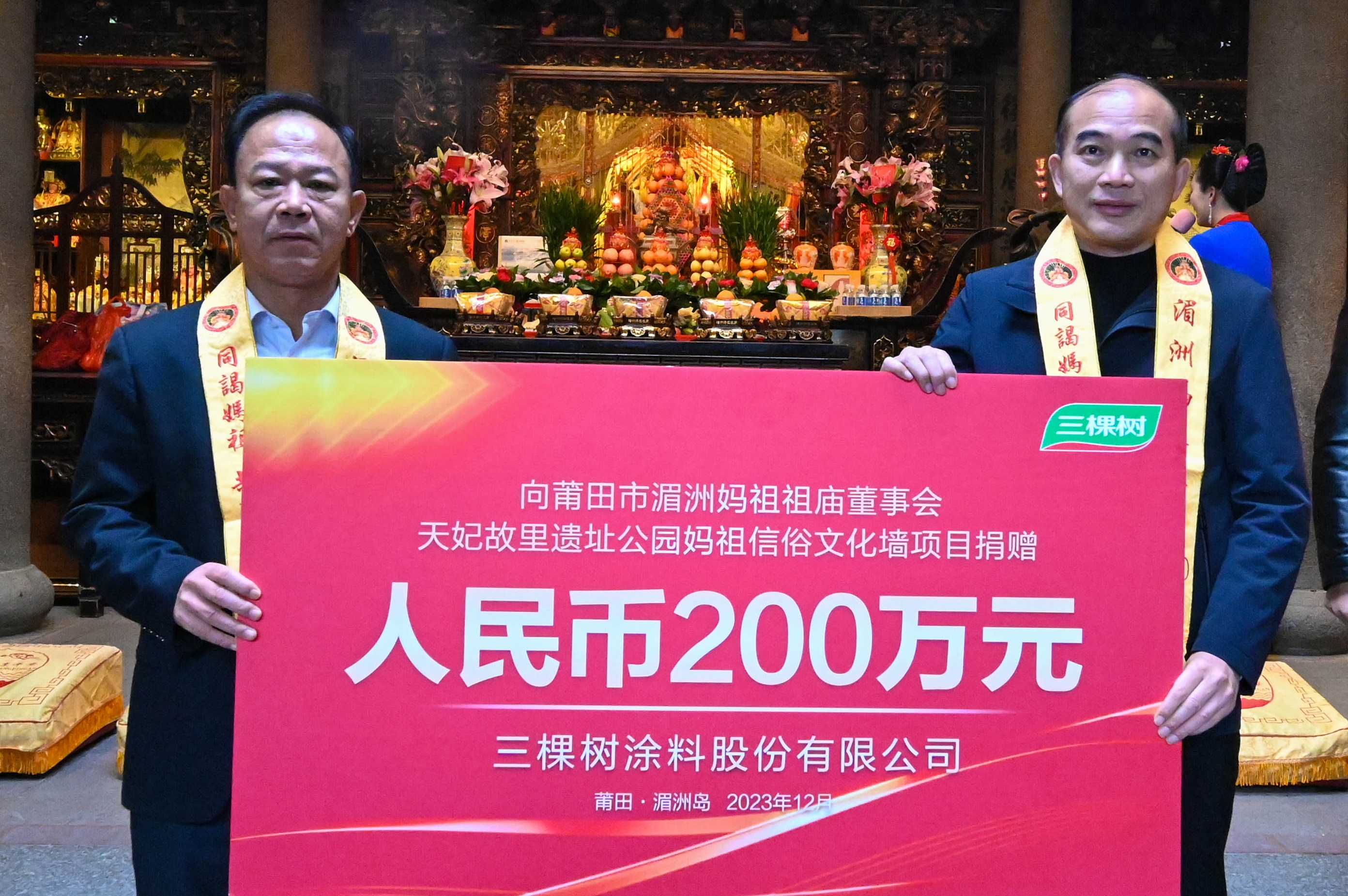 福建日报·新福建客户端 12月18日讯(记者 陈盛钟 通讯员 周建国)17日,三棵树涂料股份有限公司董事长兼总裁洪杰一行来到湄洲岛参访交流,并向湄洲妈祖祖庙董事会捐赠200万元,用于天妃故里遗址公园妈祖信俗文化墙项目建设。