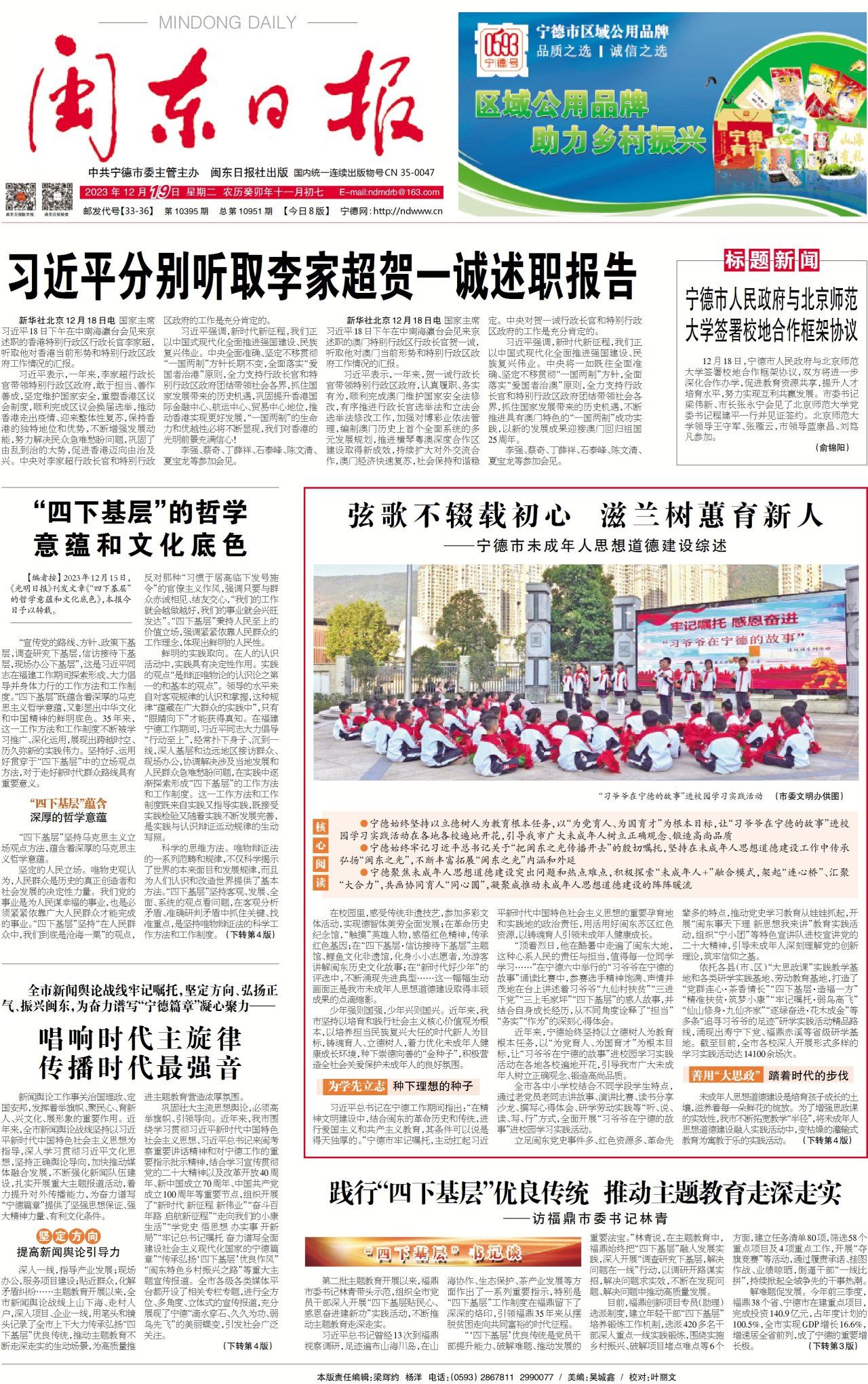 立足闽东党史事件多、红色资源多、革命先辈多的特点,推动党史学习教育从娃娃抓起,开展“闽东事天下理 新思想我来讲”教育实践活动,组织“宁小团”等特色宣讲队进校宣讲党的二十大精神,引导未成年人深刻理解党的创新理论,筑牢信仰之基。