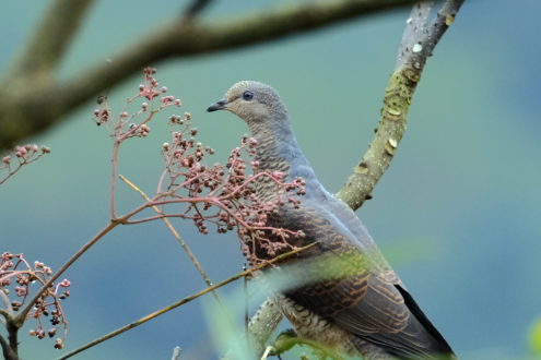斑尾鹃鸠,体长33~40厘米,是体大而尾长的褐色鹃鸠。背及尾满布黑色或褐色横斑;头灰,颈背呈亮蓝绿色;胸偏粉并渐至白色的臀部;雌鸟颈背无亮绿色。生活于海拔3000米以下的山地森林。通常结小群活动,具有疾速穿越树冠层的能力。主要以榕树果实和其它植物浆果、种子、草籽为食,有时也吃稻谷等农作物。模式产地在印度尼西亚,中国主要分布于四川、福建、云南、海南等华南一带。