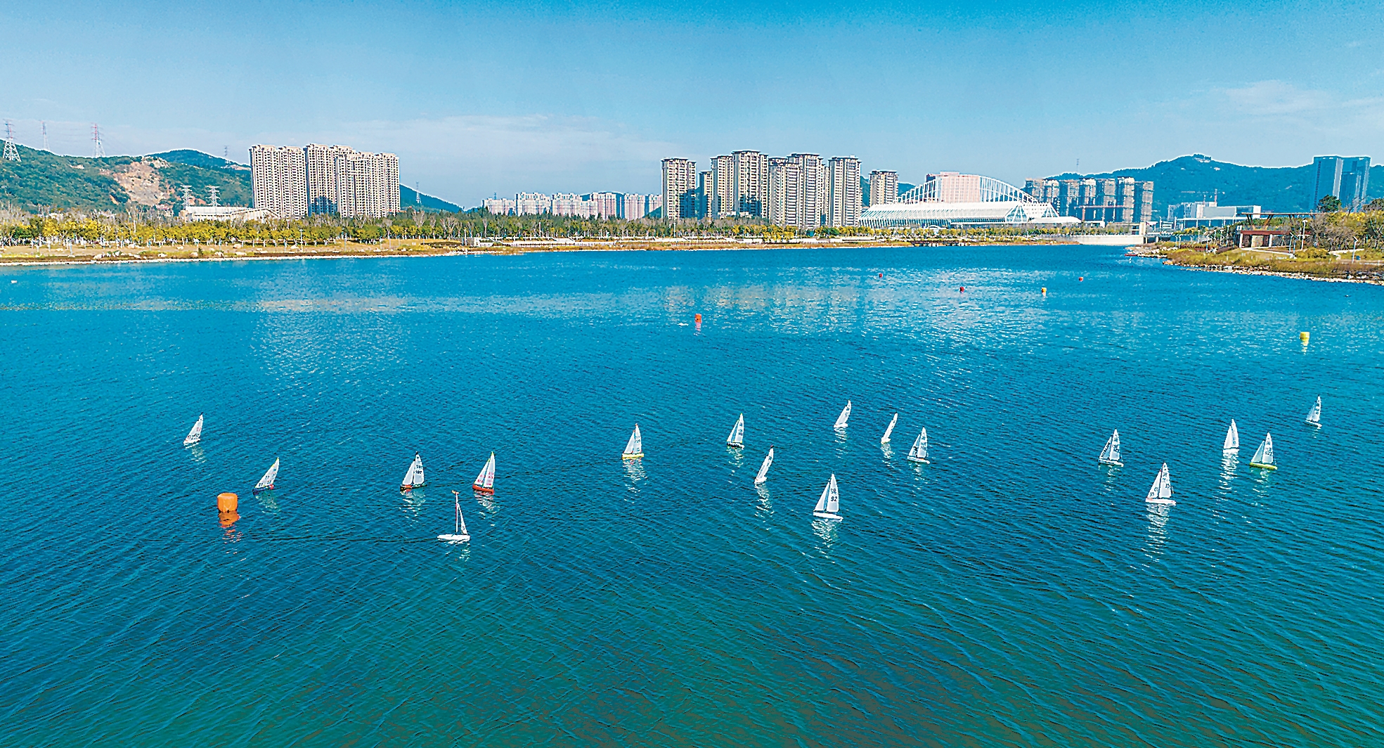 本次比赛场地位于风景秀丽的如意湖畔,设置了F5-PS550级遥控帆船、F5-S900级遥控帆船、F5-E级遥控帆船、F5-ST950级遥控帆船共4个级别的项目。