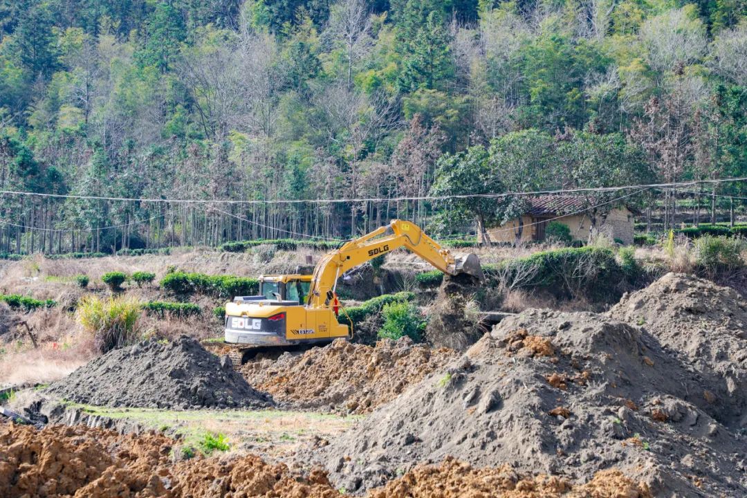 与此同时,在渭田镇杉坑村,机械轰鸣声响彻田间,挖掘机、推土机轮番作业,项目建设紧张有序推进。杉坑村书记黄青说,原本道路两侧一边是旱地,一边是烂泥田,经过提升改造之后,才形成如今的平整田块,现在已经能做到“旱能灌,涝能排”,这些让老百姓感受到实实在在的好处。