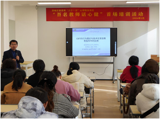 本次培训班为期一天,邀请福建师范大学心理学院教授、博士生导师郭明春教授作题为“CBT的认知技术在个体咨询与家庭教育指导中的应用”的专题培训。郭明春教授从识别自动思维、识别深层信念、认知重建等角度切入,结合典型案例进行深度剖析,以理论授课、互动练习、自学反思的形式,进行系统讲解和实操模拟,进一步加强心理健康教师队伍的专业支撑与实操水平。