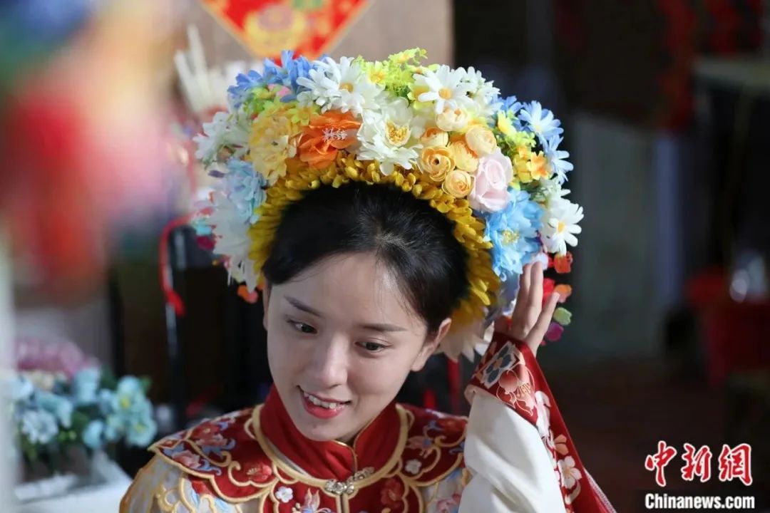 游客在泉州蟳埔村体验当地渔女“簪花围”头饰。张旭 摄