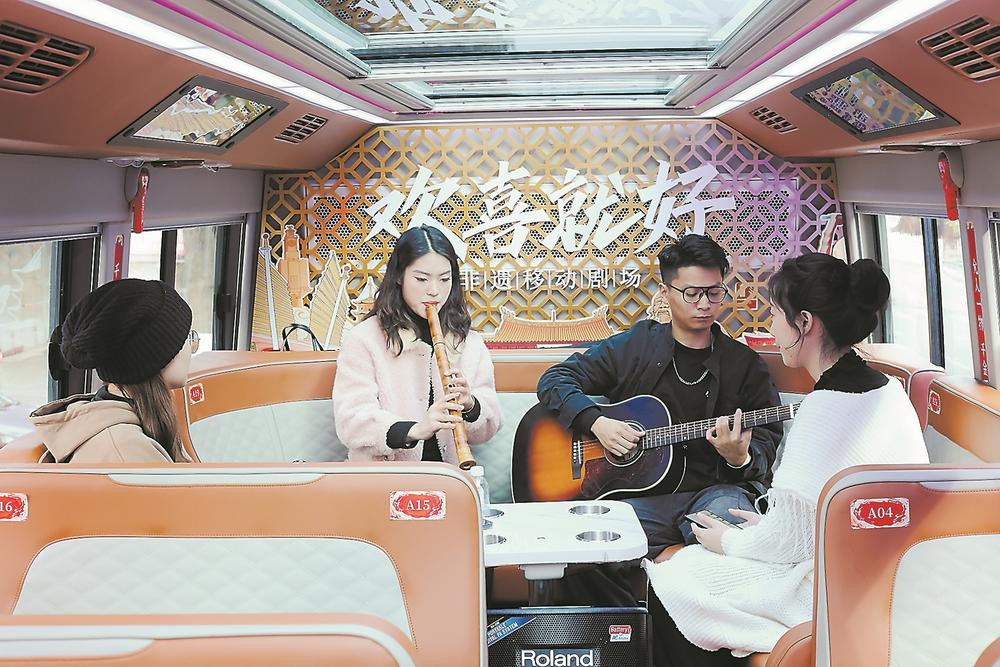 “三分天注定,七分靠打拼,爱拼才会赢……”行驶过程中,车上不时传出欢快的歌声(上图)。“在这里,您还可以感受到闽南语歌曲中流淌的欢乐与自由,体验传统艺术带来的心灵愉悦,在欢笑中感受非遗文化。”