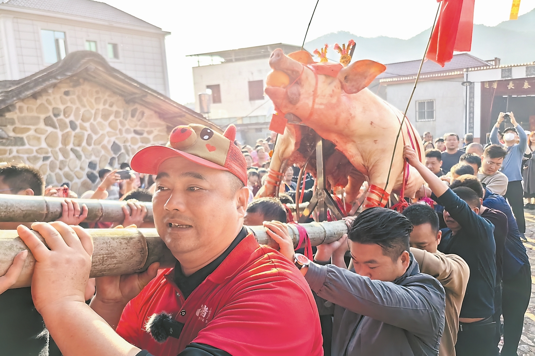 “让一让!让一让!”人群中,8名壮汉抬着一头大猪经过,这头大猪由红绳捆扎,头戴金花,口衔红橘,背上盖着大红的印章。正月初八,一年一度的“赛大猪”活动如期在长泰区马洋溪生态旅游区山重村举办。每个村民小组提供一头大猪,一一过秤后评出重量最大的“猪王”,并将大猪送进家庙祈福。