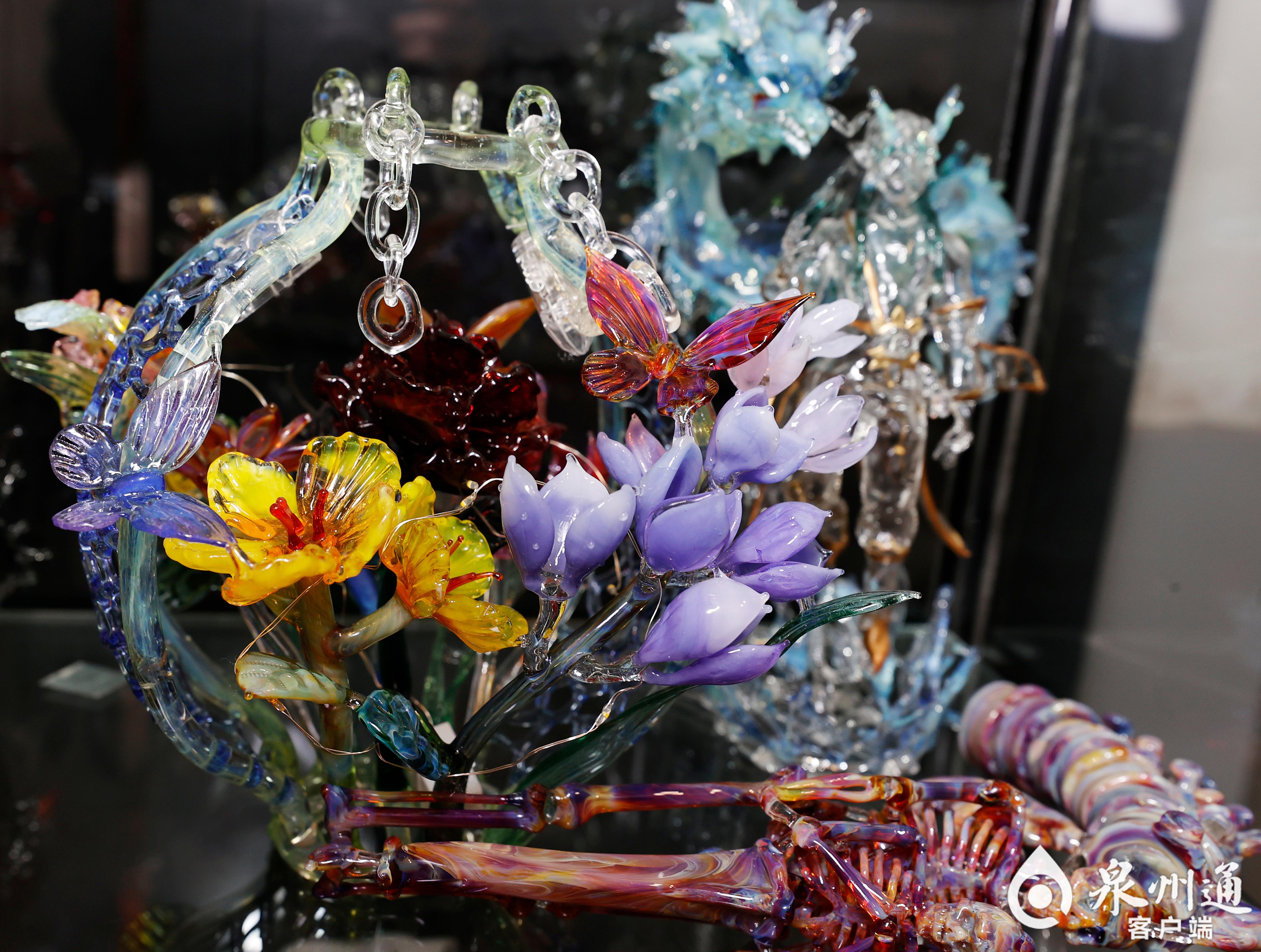 在中心市区新路埕的一家玻璃艺术工作室内,一对一的体验课程正在进行中。在灯工火枪下,一片片玻璃叶子浴火而生,精致剔透,煞是好看。在工作台旁的展示柜上,各式各样的灯工玻璃作品在灯光下流转着璀璨的光泽,玻璃杯、镜子、发簪、项链、手串、戒指,还有不同造型的摆饰……为前来体验的市民打开了玻璃手作“新世界的大门”。