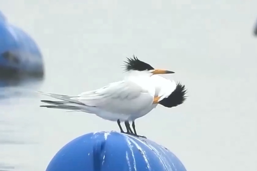 用长焦镜头来观察中华凤头燕鸥,可以看到它们全身洁白,头顶上有黑色的冠羽,嘴的前端是黑色的,因此又被叫做黑嘴端凤头燕鸥。只见它们三两一组,站立在养殖浮球上,周围还有上百只大凤头燕鸥。