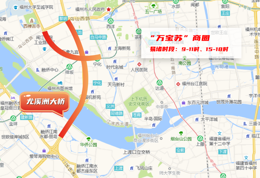 进城方向4月6日17-21时较为拥堵,进城方向拥堵时,可从福州西下高速经建平路-橘园洲大桥-金山大道-金山大桥绕行进城。