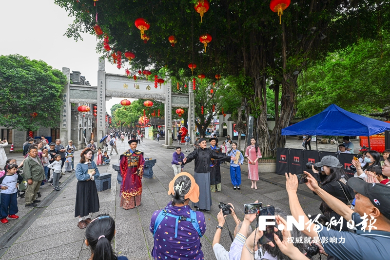 该剧导演、福建省实验闽剧院副院长林杰介绍:“这部戏剧由我们院团和鼓楼区联合创作,以传统闽剧唱腔为基调,创新融合多元性沉浸式表演,创新借鉴话剧手段,以快闪的形式打破舞台边界,走到市民游客身边。希望让观众在历史交互中领略闽都文化魅力,近距离‘触摸’400多年的闽剧艺术。”近年来,省属文艺院团持续创新表演内容和形式,当天现场还邀请省杂技团带来国风杂技、省歌舞剧院演员献唱《天演论》。