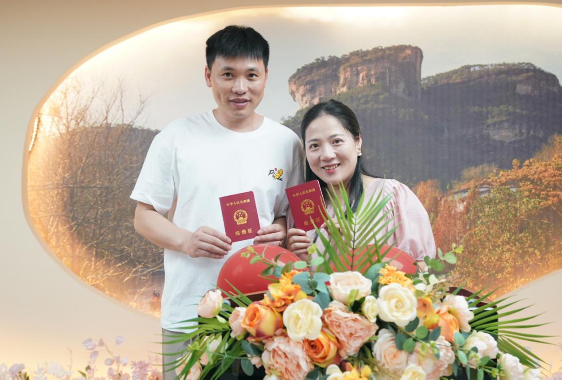 5月20日,武夷山市民政结婚登记厅内一对情侣领到结婚证后合影。