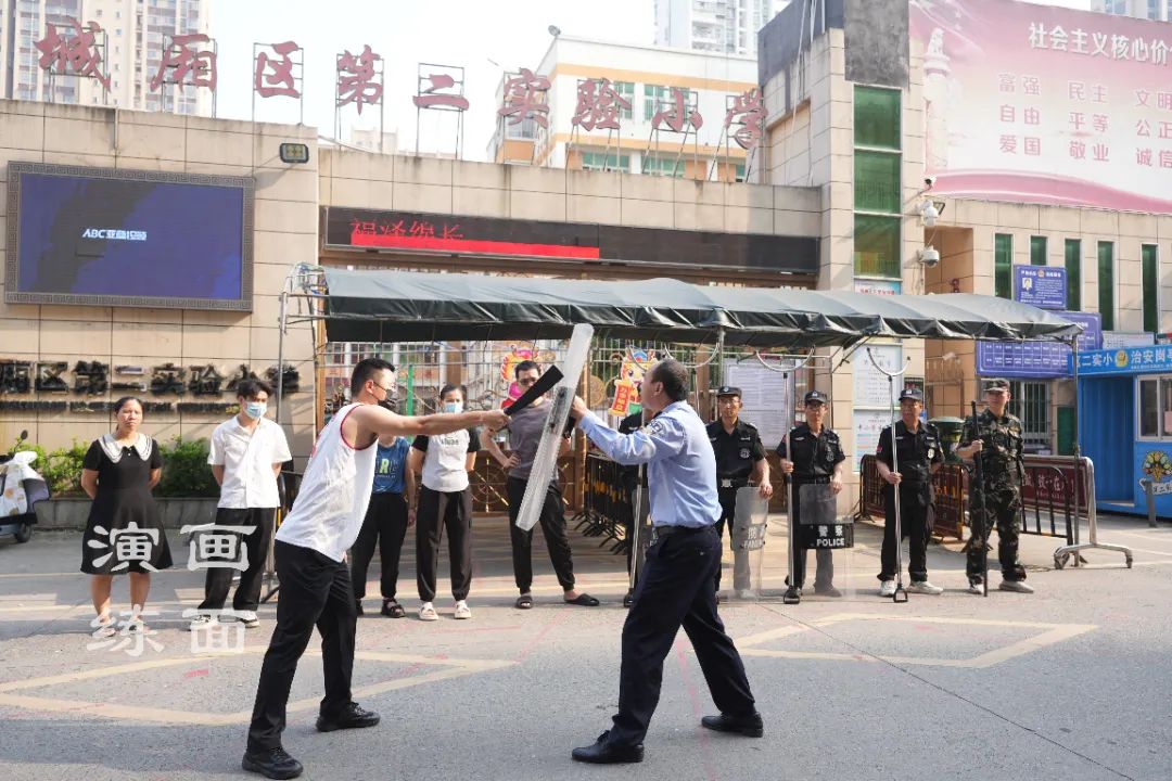 演练模拟在学生放学之际,一名男子不停地在校园门口徘徊,并试图进入校园。其异常行为引起了学校保安人员的注意,随即上前询问并驱赶。突然,该男子拔出随身携带的“刀具”冲向孩子,试图伤害学生。
