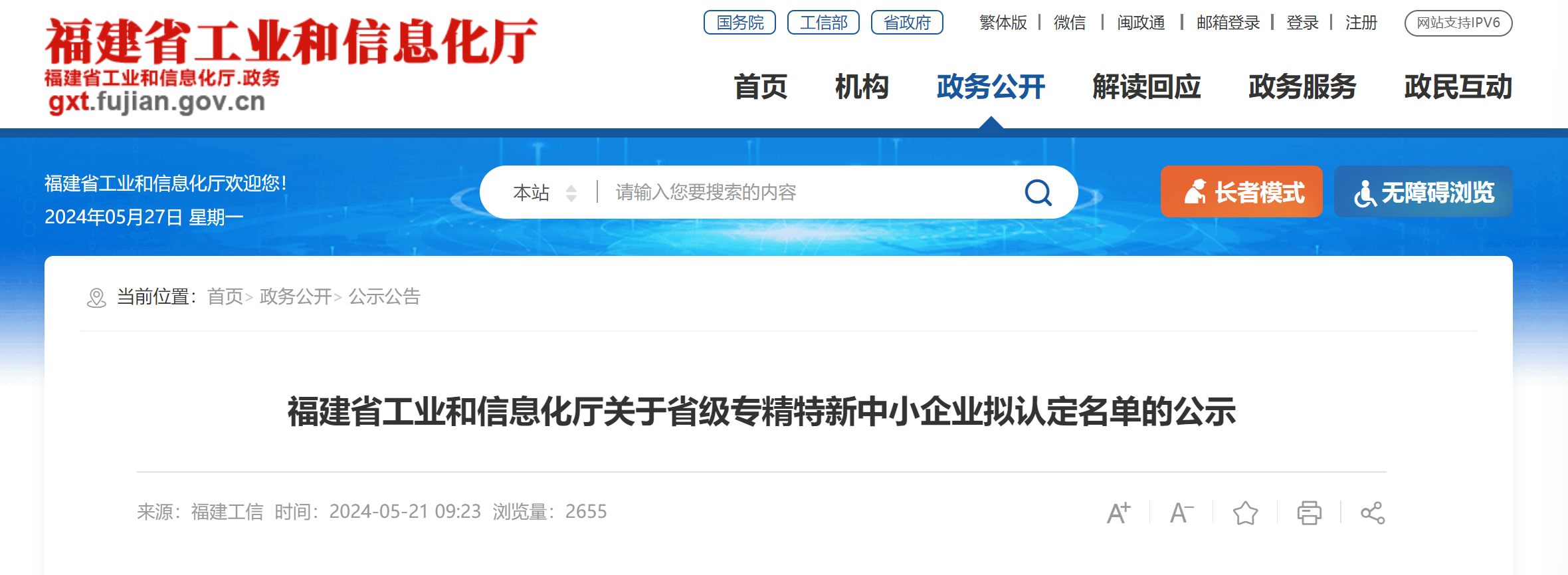 近日,福建省工业和信息化厅发布公示,拟认定65家福建省级专精特新中小企业——