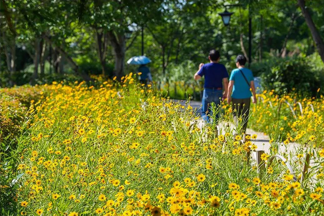花海公园里,“茉莉圃”及“童趣天地”景点的茉莉,“湿地人家”景点周边的绣球花、金鸡菊也都盛放了。