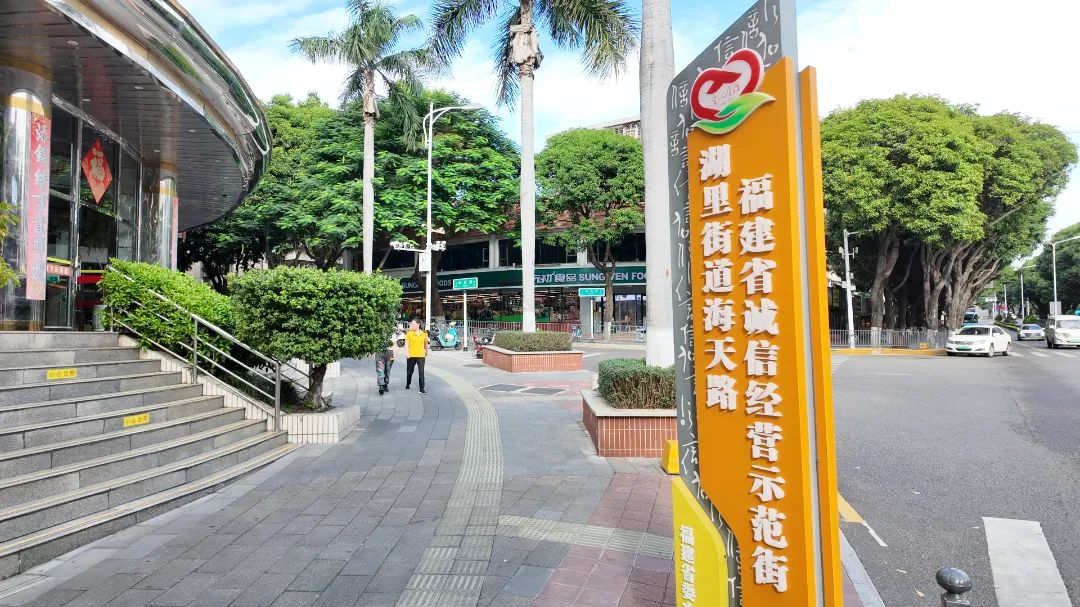 全长约800米的海天路商业街,店铺林立、商贸繁盛,充满着生活的烟火气。2020年以来,湖里区推动提升海天路营商环境,完善“评、测、督、查、惩”为一体的“诚信商铺”评选标准,鼓励全街区商户规范经营、诚信经营、文明经营,并为它们“评星”。2021年,海天路商业街被评为省级诚信经营示范街区,“政府引导、社会监督、行业自治、行为自律”的诚信经营生态在这里孕育、成长。