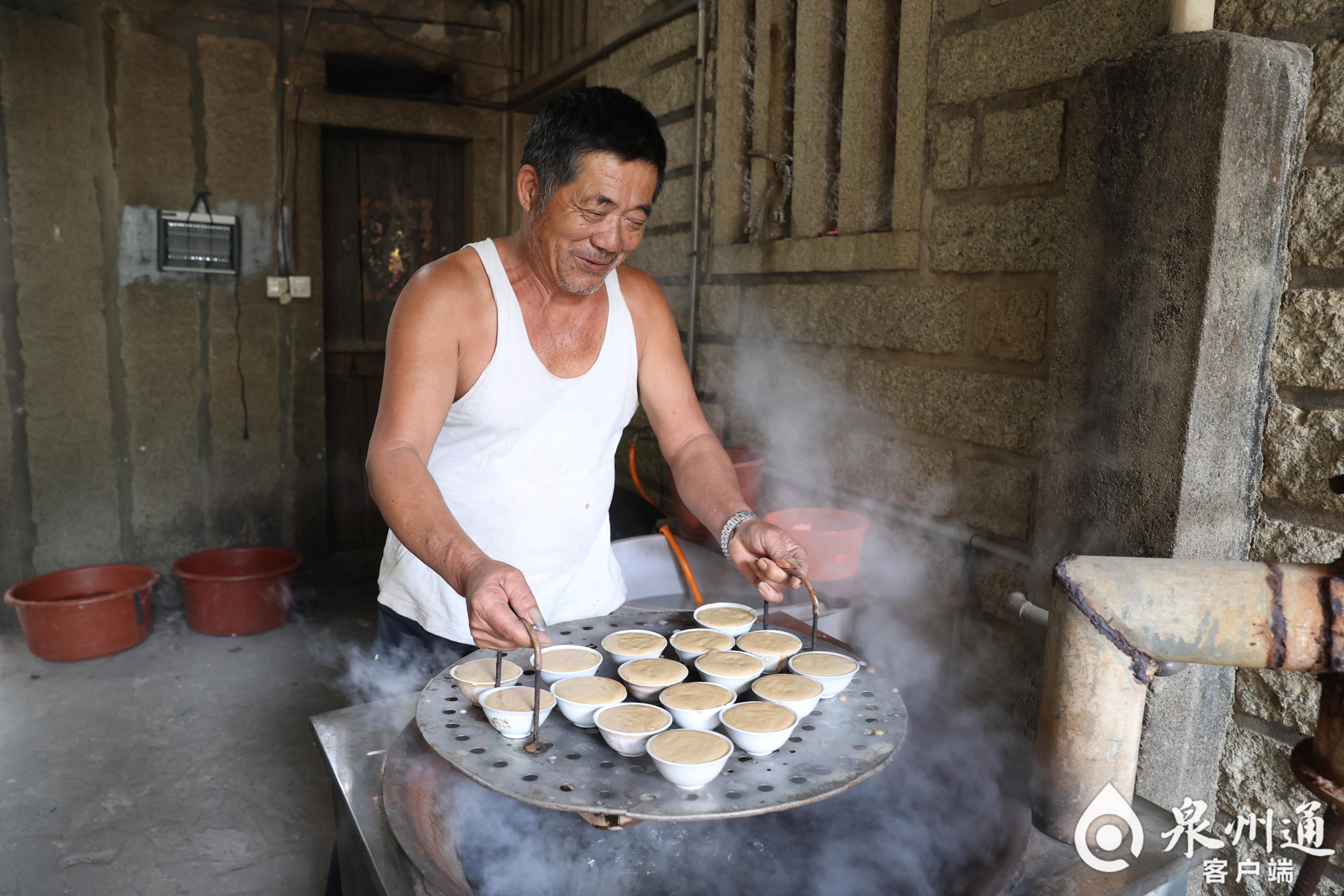 11月7日上午9时许,在晋江安海镇坝头村,一座古色古香的闽南红砖古厝旁,袅袅炊烟升起,63岁的手艺人王恭图正在蒸制碗糕。灶炉下,柴火烧得正旺,大铁锅水蒸气吱吱冒响,阵阵米香传来。不多时,碗糕出炉,表面洁白“开口笑”,微微甜香诱人生津。“坚持传统手艺,把握米浆发酵和火候,烧柴火,用瓷碗,这是老一辈人传下来的古早味。”王恭图说,20世纪80年代,村里有100多户人做碗糕,现在只剩10多户,他不能用电蒸制,因为那样碗糕的色香味形都差得多。很多在外的乡亲回来,就喜欢这种古早味碗糕,那是家乡记忆。