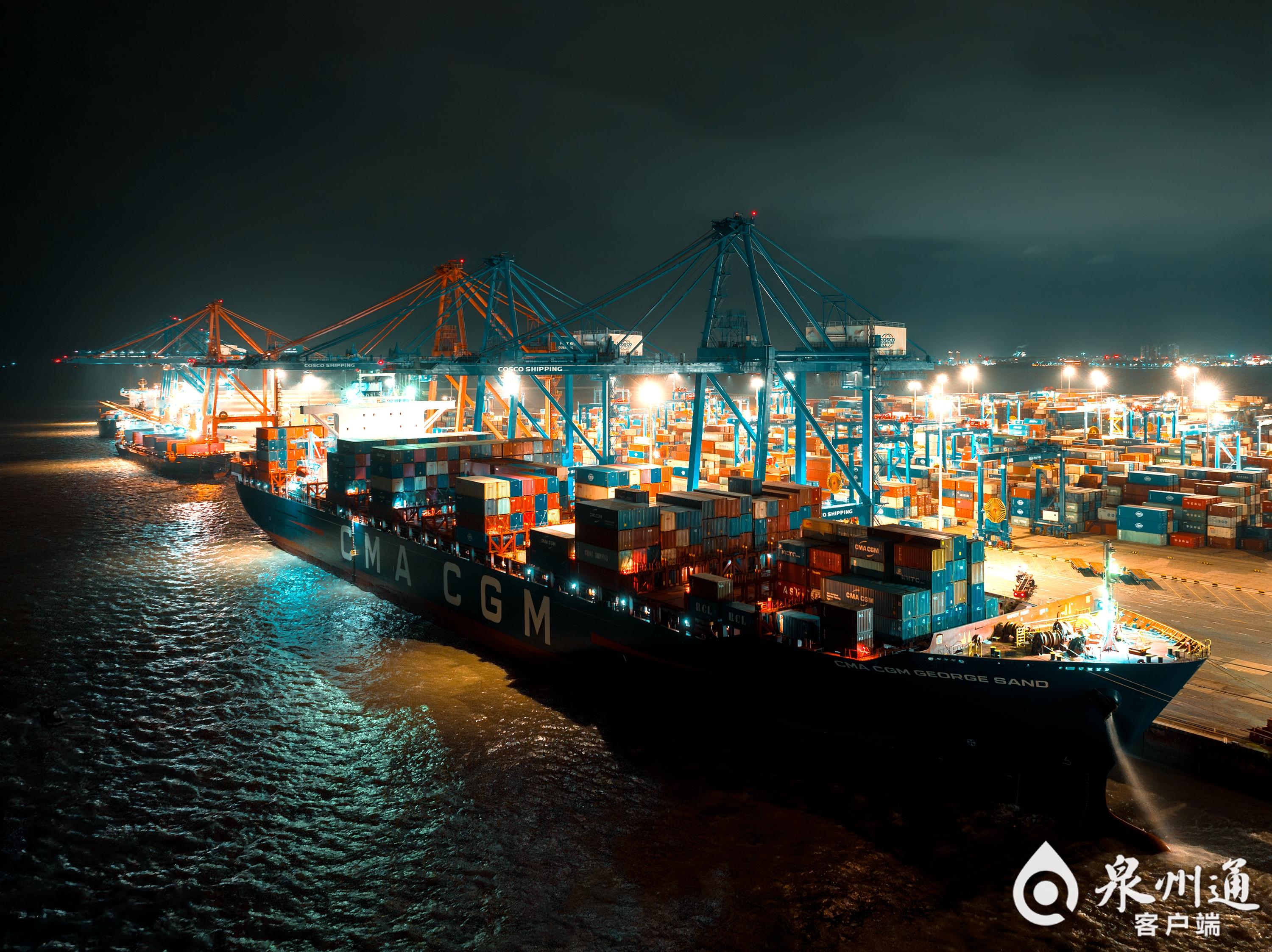 夜幕下,泉州石湖港区灯火通明,一派繁忙景象。该码头正在对菲律宾等共建“一带一路”国家的出口集装箱班轮进行吊装作业。