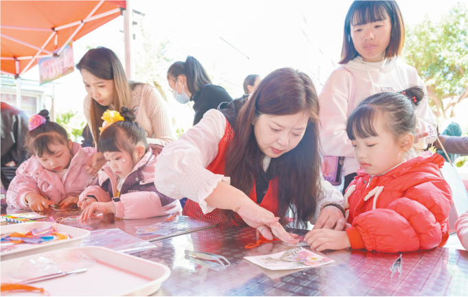 巾帼志愿者教小朋友做手工。