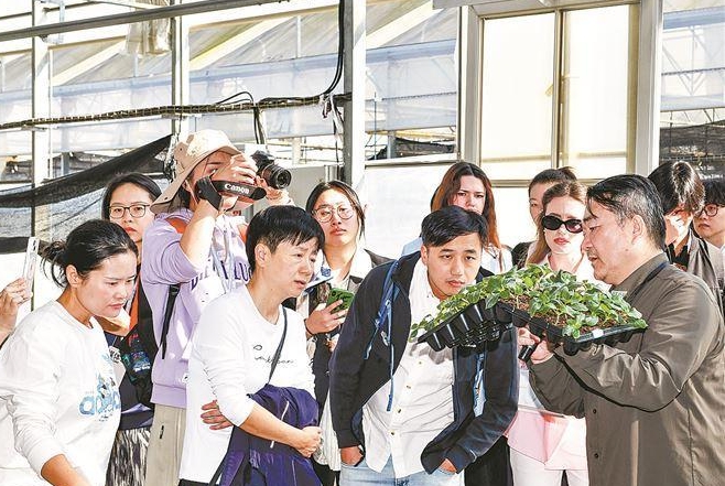 在同安闽台农业融合发展(种子种苗)产业园,台胞曾明宝(右)为参观者讲解育种技术。(通讯员 夏海滨 摄)