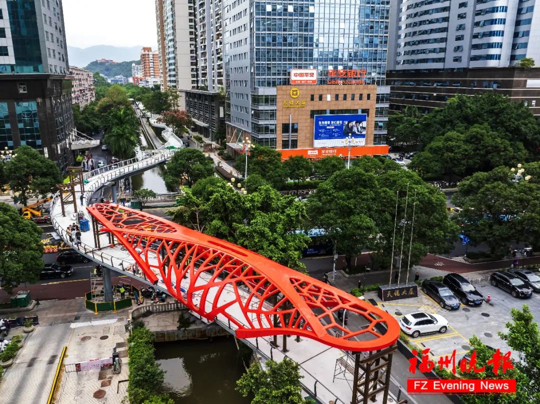 项目负责人陈铭介绍,“百福冠”长151米,整体重约140吨,以喜庆“中国红”为主色调,融合了福州的海洋文化、温泉文化、榕树文化,天桥顶棚为波浪造型,由双曲变截面方形钢管的主龙骨与榕树造型次龙骨组合形成,同时通过3D建模方式生产加工,独特的设计和建造方式,在全省城市天桥建造中尚属首座。