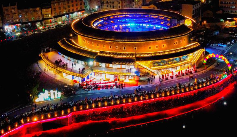 12月14日晚,福建土楼永定洪坑土楼景区的“土楼大福宴”热闹开席,各方游客纷至沓来,欢聚一堂,重现“大福共享、千人同品”的壮观景象。客家芋子包、炒发粄、牛肉丸、姜酒鸡等一盘盘地道的土楼客家圆笼餐摆上桌面,八方来客举杯共饮,同享盛宴。