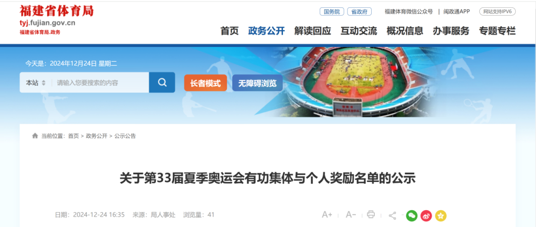 在第33届夏季奥运会上,我省体育健儿弘扬中华体育精神和奥林匹克精神,团结协作、奋勇争先,夺得2枚金牌、2枚银牌、1枚铜牌和3项第五名、1项第六名、3项第七名的优异成绩,为祖国争了光,为家乡添了彩。根据省政府常务会议和省委常委会会议精神,拟对我省参加第33届夏季奥运会有功集体与个人进行奖励(详见附件)。为广泛听取社会各界意见、接受群众监督,现将名单予以公示。公示时间:2024年12月24日至12月30日,公示期间,社会各界单位和个人如有异议,均可通过来电、来函等方式向福建省体育局人事处反映,内容要求真实有据,并提供有效联系方式。邮寄地址:福州市鼓楼区江厝路15号福建省体育局人事处,邮编:350012附件:省委、省政府拟给予参加第33届夏季奥运会有功集体与个人奖励名单