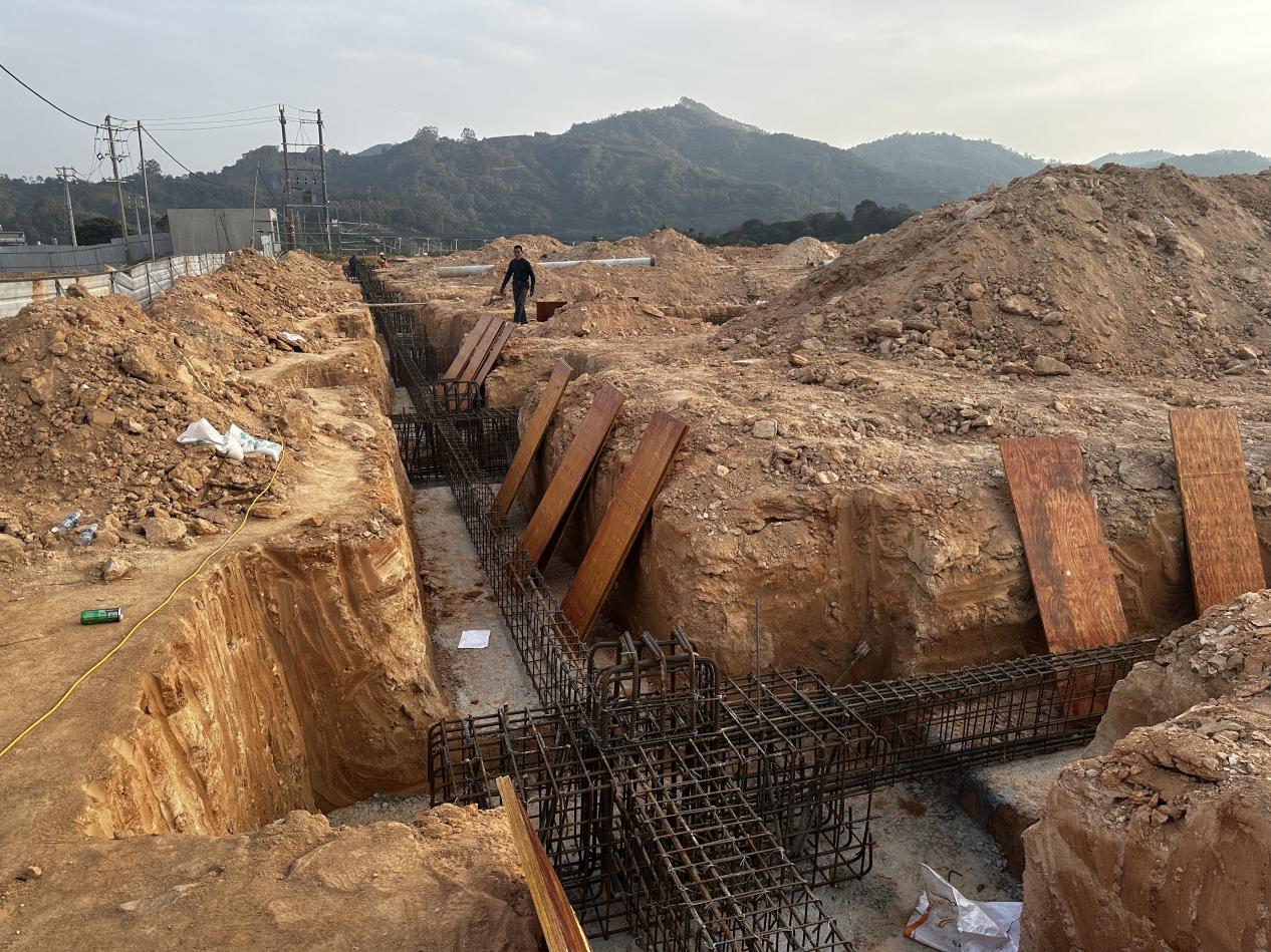 在项目施工现场,工人与各类机械默契配合,正在进行基础梁钢筋绑扎、承台模板安装等地基基础施工作业。后续将全面进入地上主体结构施工阶段,一期厂房预计于2025年4月份基本完工。