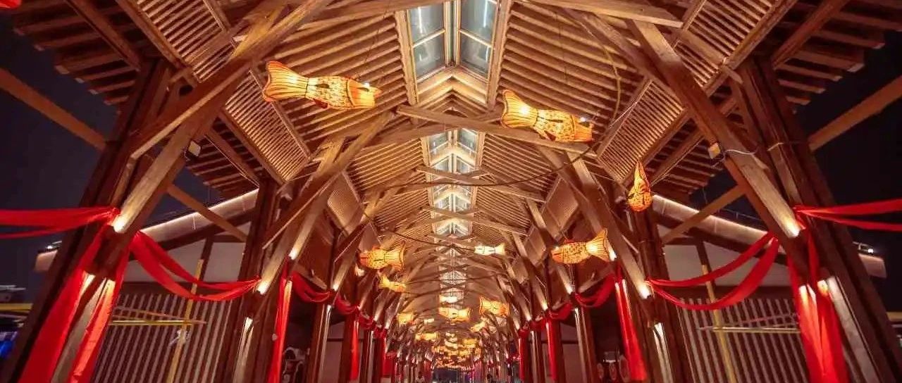 这座桥可不一般,外观造型为木拱廊桥,以非遗为主题建造,古韵今风交织,桥屋典雅,赏景绝佳。