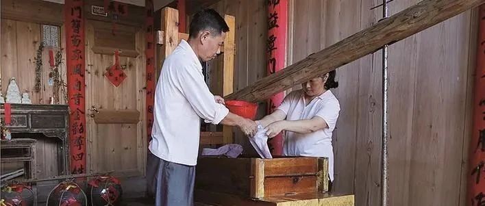 张在沾酿酒,讲究天时、地利、人和。选料严苛,优质糯米、高山泉水、上等乌衣红粬,三者缺一不可。在这位酿酒老师傅的巧手下,这些简单的原料经过浸米、蒸饭、凉饭、拌粬落缸、发酵、开耙、封缸、压榨、灭菌、封坛、陈化等一系列复杂而精细的工序,最终化身为色泽金黄、香气扑鼻的佳酿。2023年顶太红黄酒制作技艺被列为省级非物质文化遗产。
