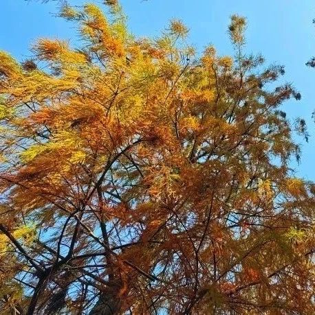 落羽杉的叶子闪烁着金色的光芒