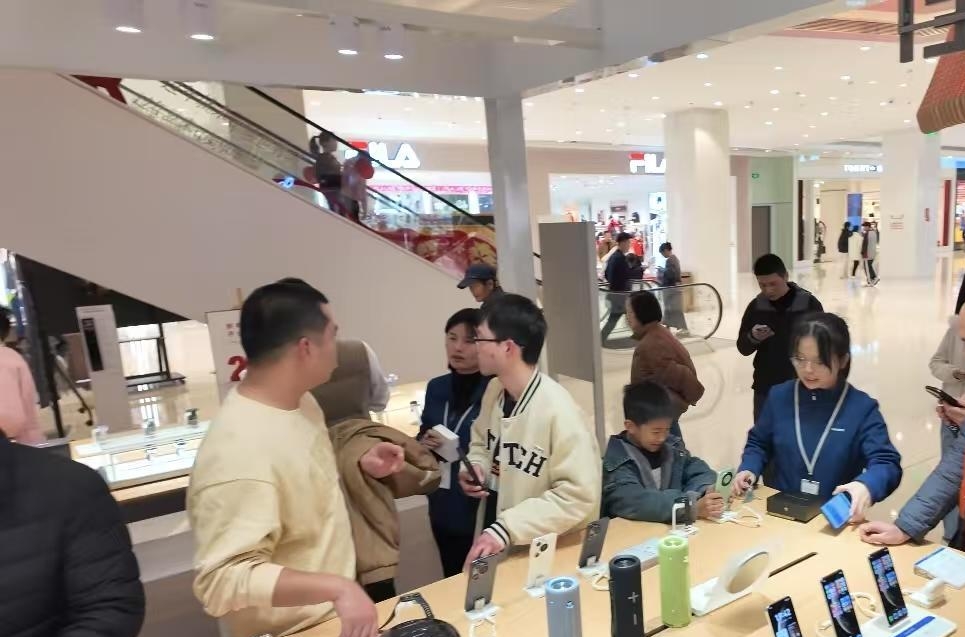 图为华远电讯的华为生活馆(中骏世界城)市民忙换新选购过大年