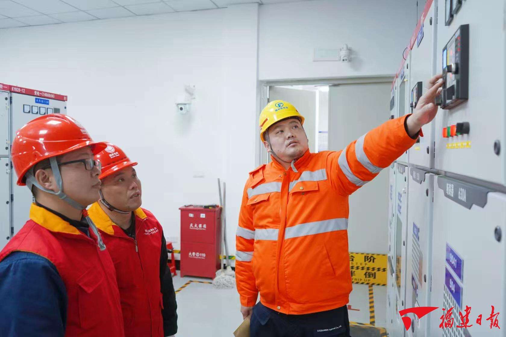 在平潭高铁中心站配电站房,国网平潭供电公司共产党员服务队队员何武杰和薛学桂重点对客户内部设备状态进行检测和测温测负荷,做好用电安全延伸服务保障工作。他们手持红外测温仪和局放测试仪,对设备测温测负荷,同步记录相关数据,通过全方位的状态监测,确保电气设备运行正常。